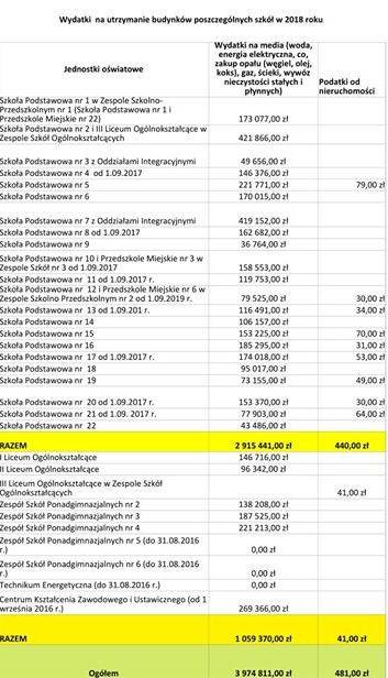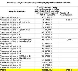 Na dole znajdziecie wydatki, jakie gmina poniosła w związku z utrzymaniem budynków poszczególnych szkół i przedszkoli w 2018 roku. Jak zaznaczono w odpowiedzi na interpelację powyżej, w koszty utrzymania budynków nie wliczono wydatków poniesionych na remonty niezbędne do funkcjonowania placówek.