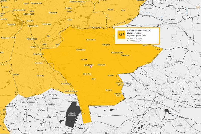 Instytut Meteorologii i Gospodarki Wodnej ostrzega, że w Jaworznie mogą występować intensywne opadu deszczu. Ostrzeżenie dotyczy środy, 25 maja w godzinach od 10:00-16:00.