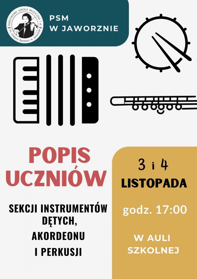3, 4 listopada – godz. 17.00, Popis uczniów sekcji instrumentów dętych, akordeonu i perkusji,