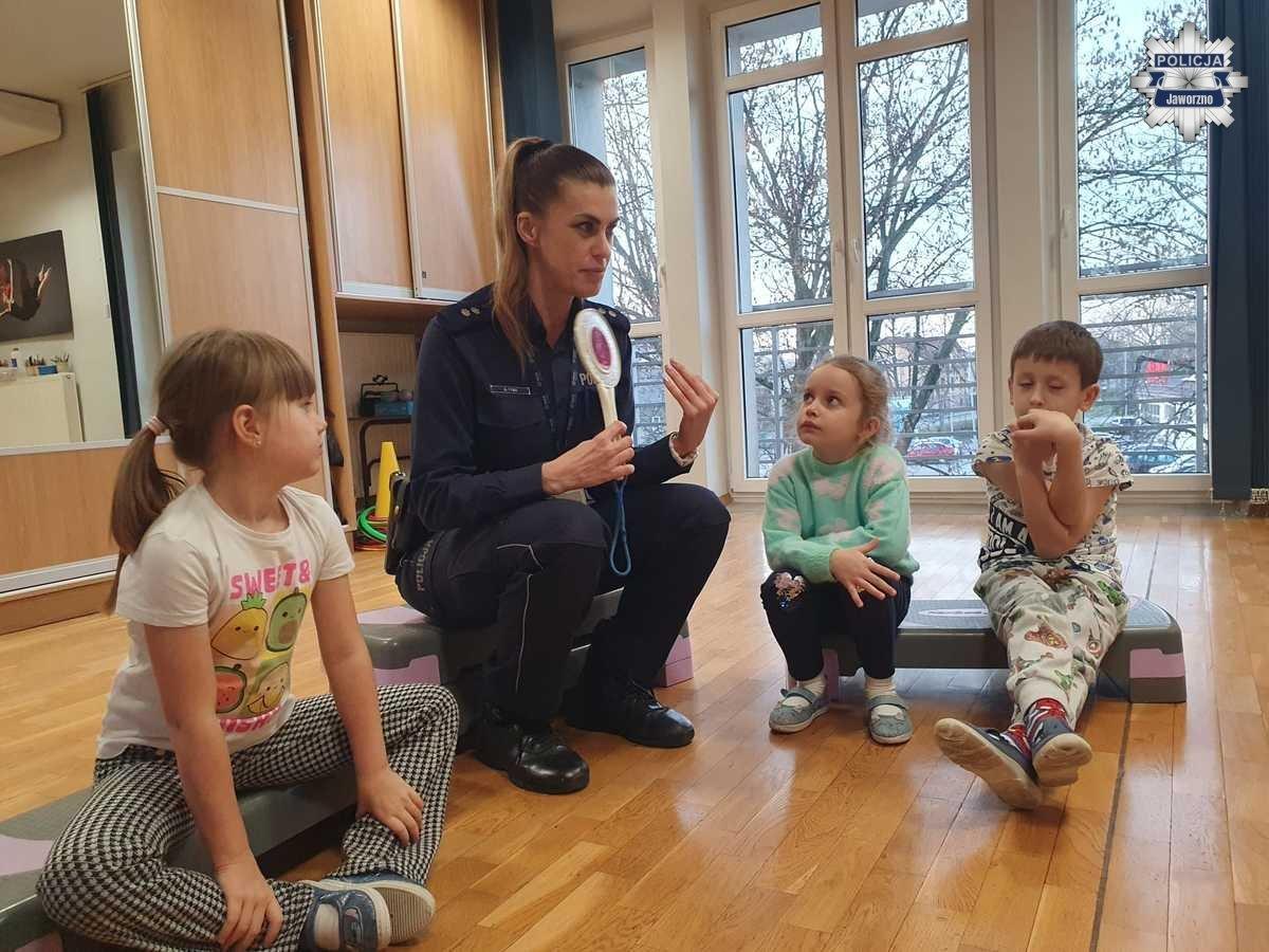 Funkcjonariuszka odwiedziła najmłodszych uczestników warsztatów "Edugo". Tłumaczyła, dlaczego powinno się nosić odblaski, szczególnie w okresie jesienno-zimową, a także pokazywała, jak prawidłowo przez jezdnię i na co zwracać uwagę, gdy w pobliżu pojawia się pojazd uprzywilejowany.