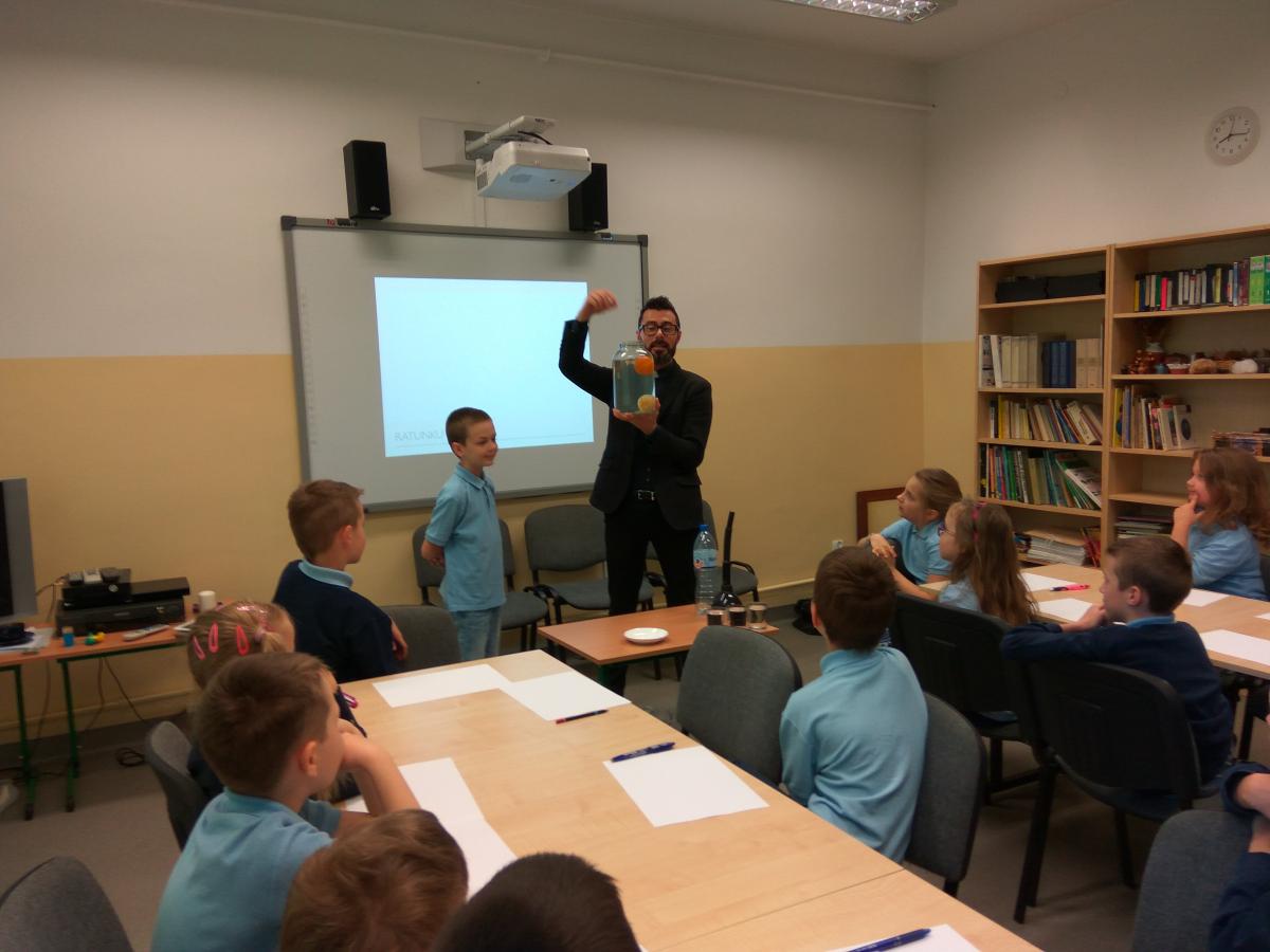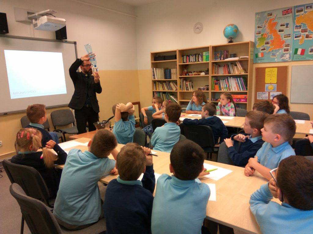 Katecheza miała tytuł „Ratunku SMOG”. Słowo smog to jednak w tym przypadku akronim, należy więc go rozkodować następująco: Smutek, Marudzenie, Obrażona mina, Grymasy. Ksiądz Łukasz opowiadał o emocjach i o tym, jak sobie z nimi radzić za pomocą trzech MEGASUPER pomysłów Pana Boga. Spotkanie było niezwykłe, ponieważ Ksiądz, za pomocą prostych doświadczeń (z wykorzystaniem wody, pomarańczy, lejka, butelki, soli, kaszy, balonów czy piłeczek) przedstawił naprawdę trudne tematy.