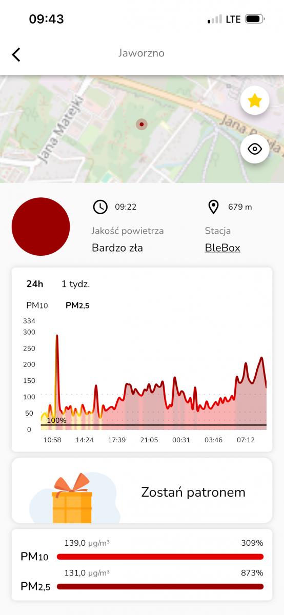 Do listu dołączył zrzut ekranu z pomiarami jakości powietrza w jednej z lokalizacji na terenie Jaworzna.