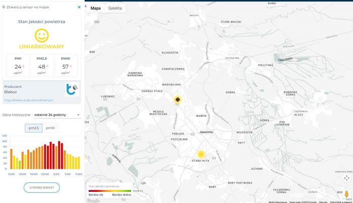 Na terenie miasta w tej aplikacji widoczne są dwa czujniki. Jeden między ulicami Olszewskiego i Matejki, a drugi przy ulicy Cegielnianej. Poniżej zrzut ekranu wykonany 5 grudnia 2025 roku.