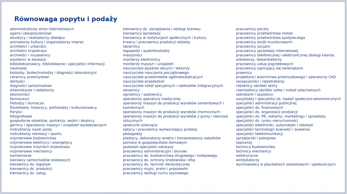 Zawody zrównoważone to te, w których liczba ofert pracy będzie zbliżona do liczby osób zainteresowanych podjęciem zatrudnienia w danym zawodzie.