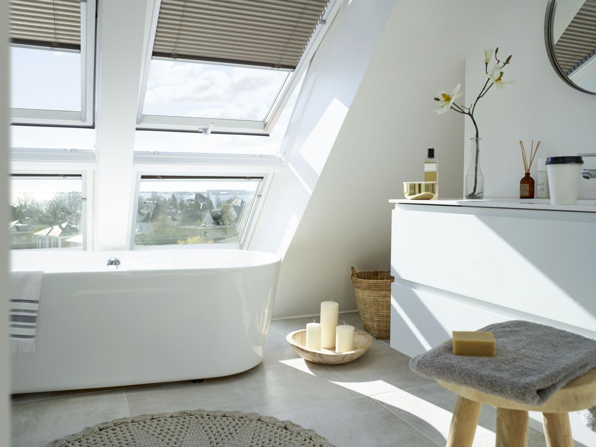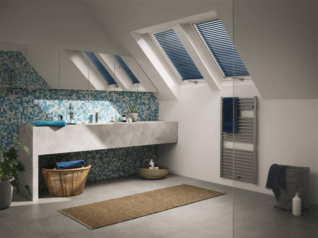 Okna dachowe w łazience i kuchni warto wyposażyć w dodatkowe akcesoria, gwarantujące prywatność i kontrolę światła, takie jak żaluzje VELUX PAL. Są odporne na wilgoć, łatwe do utrzymania w czystości i bardzo wygodne w użytkowaniu – ich pozycję reguluje się za pomocą suwaka. Brak wiszących sznurków sprawia, że wyglądają elegancko i estetycznie. Idealnie pasują do rozmiaru okna i można je zamontować samodzielnie dzięki systemowi Pick&Click ® .