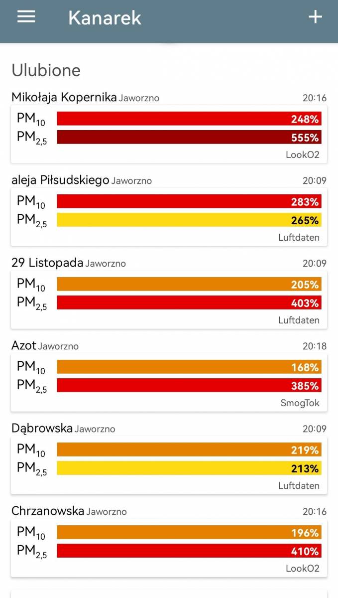 Bardzo zła jakość powietrza w Jaworznie 20 listopada. Normy poziomów zanieczyszczeń powietrza, wg wskazań w aplikacji Kanarek, zostały przekroczone o kilkaset procent.