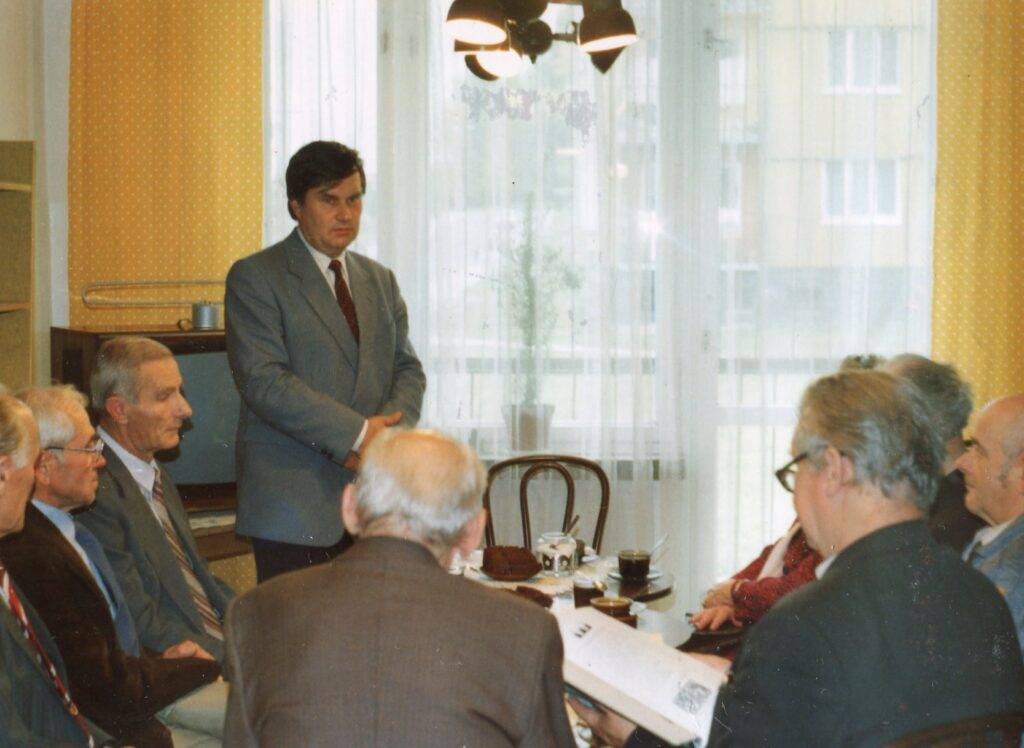 podpis pod foto: Spotkanie z dr Zawistowskim w bibliotece, 7 października 1993. W dyskusji uczestniczyli: Franciszek Ciołczyk, Stanisław Mikłas, Feliks Czerwonka, (przedstawił dwie wersje w sprawie Janka Martyniaka), Stanisław Nowakowski, Stanisław Kramarczyk, Czesław Kempiński i inni.