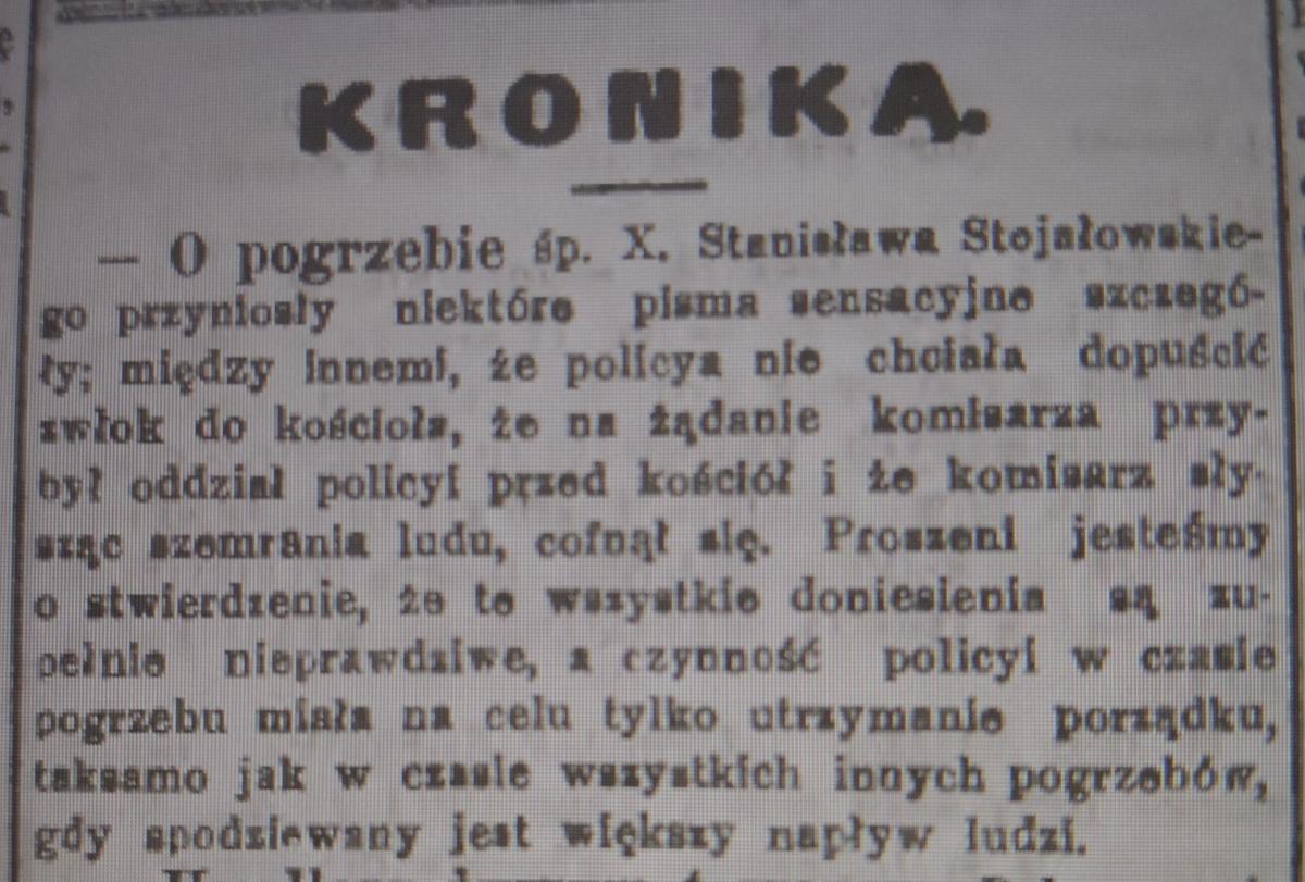 To, co się działo wokół pogrzebu księdza Stojałowskiego, rozniosło się po mieście; gazety z oburzeniem opisały postanowienie władzy. Już zaczął się burzyć lud, a tego ludu przyjeżdżało na pogrzeb coraz więcej i więcej. Mogło dojść do rozruchów, kamienie poleciałyby na magistrat. W nocy ze środy na czwartek nadeszła z magistratu wiadomość, że pogrzeb księdza Stojałowskiego może się odbyć w kościele.