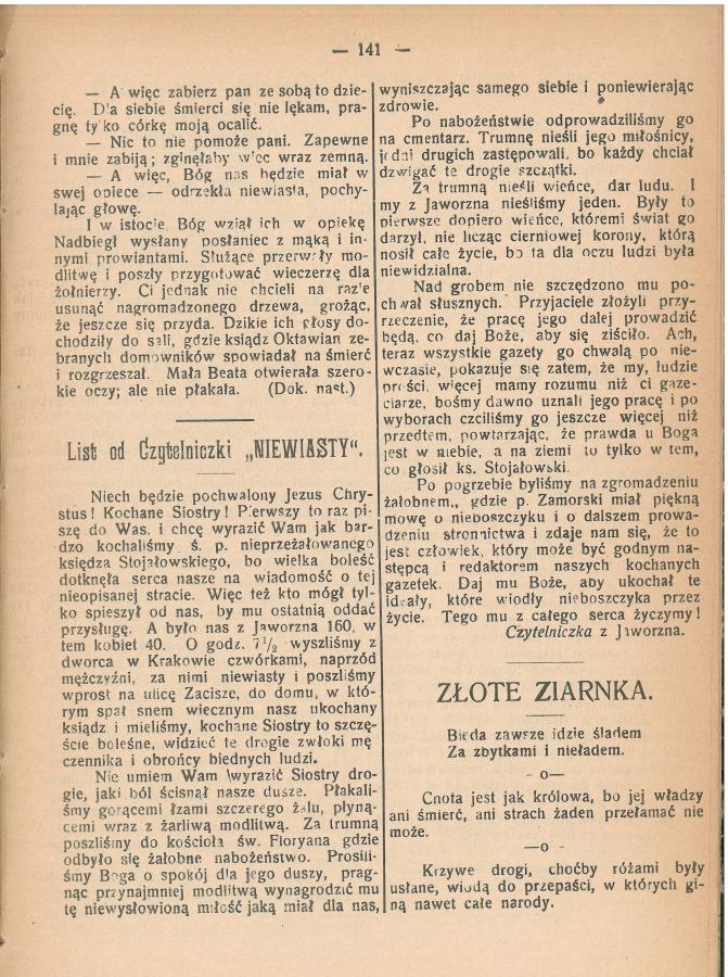 Anonimowa dla nas mieszkanka Jaworzna, czytelniczka „Niewiasty” rozsyłanej wraz z „Wieńcem - Pszczółką”, relacjonowała: „ […] kto mógł tylko, spieszył od nas, by mu ostatnią oddać przysługę. A było nas z Jaworzna 160, w tym kobiet 40”. Jaworznianie znaleźli się na dworcu krakowskim już o siódmej trzydzieści i wyruszyli do przytułku św. Rafała. Szli czwórkami: najpierw mężczyźni, potem kobiety. „[…] spał snem wiecznym nasz ukochany ksiądz i mieliśmy, kochane Siostry, to szczęście boleśnie widzieć te drogie zwłoki męczennika i obrońcy biednych ludzi. [...] ból ścisnął nasze dusze. Płakaliśmy gorącymi łzami szczerego żalu, płynącymi wraz z żarliwą modlitwą. Za trumną poszliśmy do kościoła świętego Floriana”.