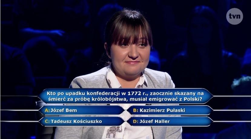 Przy pytaniu za 20 tys. zł, które brzmiało "Kto po upadku konfederacji w 1772 roku, zaocznie skazany na śmierć za próbę królobójstwa, musiał emigrować z Polski?" pani Anna postanowiła skorzystać z kolejnego koła ratunkowego: pytania do publiczności. Spośród opcji: a) Józef Bem, b) Kazimierz Pułaski, c) Tadeusz Kościuszko, d) Józef Haller, większość głosujących, bo 54 proc., wskazało na odpowiedź b) - Kazimierza Pułaskiego. Jaworznianka zaufała publiczności, wskazując na wariant b). Odpowiedź okazała się poprawna, pani Anna zdobyła 20 tys. zł.