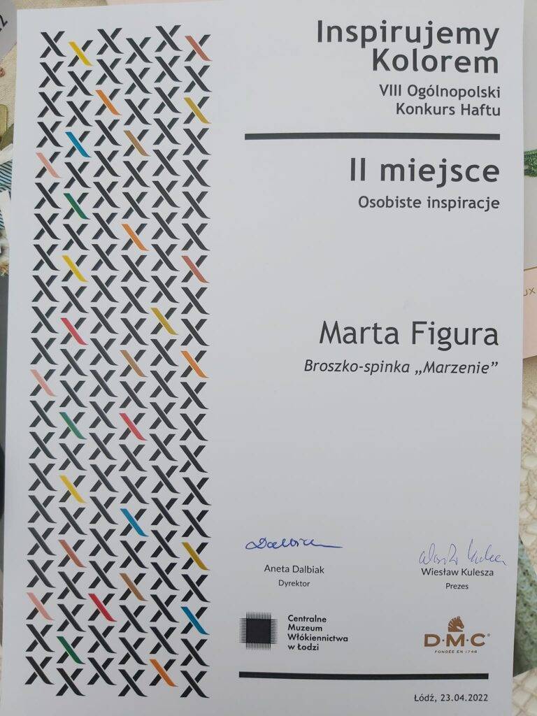 Otrzymałyśmy dyplomy pamiątkowe oraz nagrody rzeczowe w postaci materiałów hafciarskich i koronczarskich. Jesteśmy ogromnie dumne i przeszczęśliwe że zauważono i doceniono nasze prace na tak prestiżowym konkursie.                                                       Anna Kłosowicz