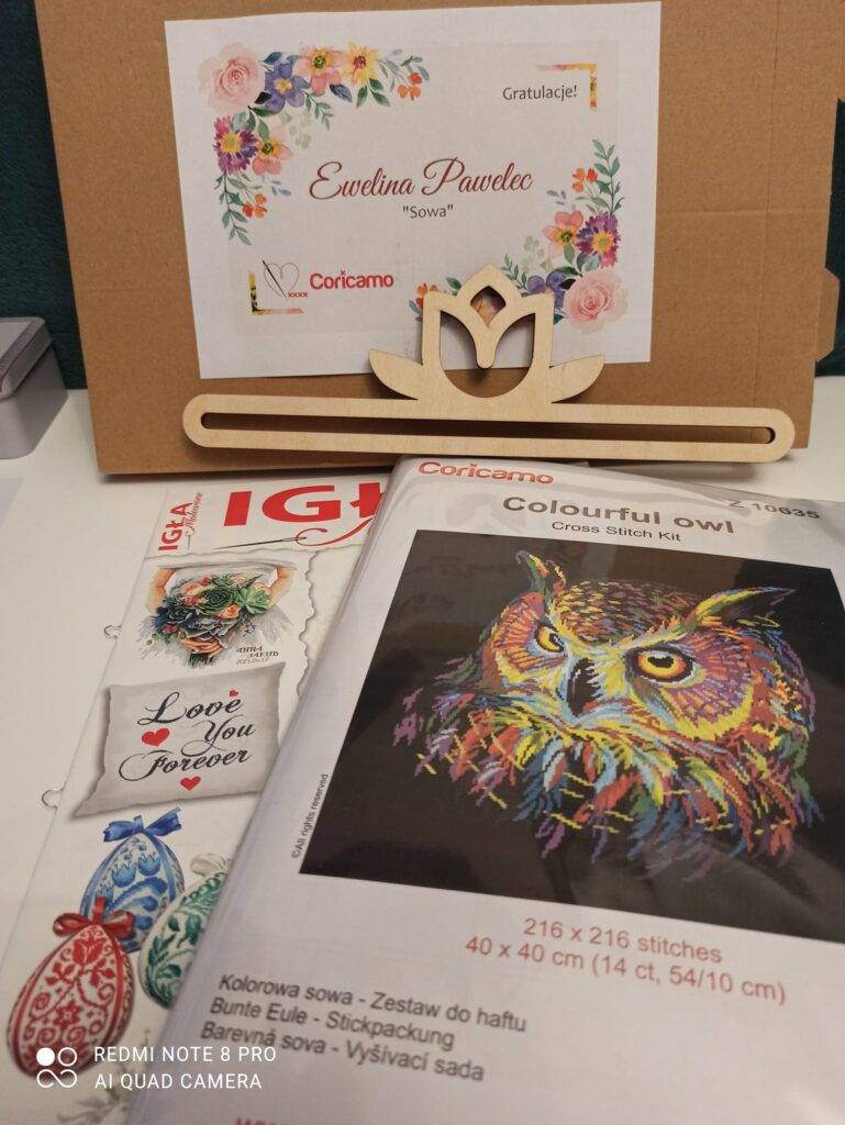 2. Ewelina Pawelec - wyróżnienie w Konkursie głównym za pracę "Sowa" (haft krzyżykowy), wyróżnienie od firmy Coricamo (sklep internetowy z materiałami hafciarskimi)