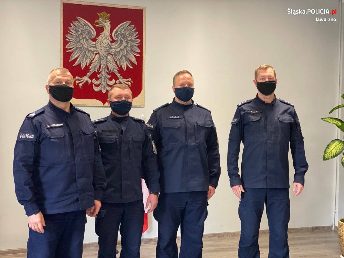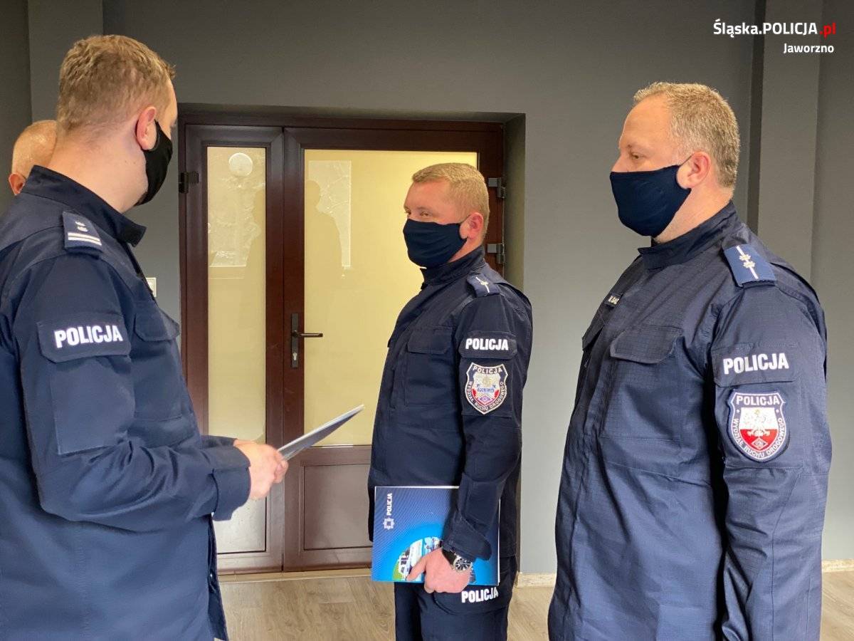 Za swoją służbę i postawę zostali wyróżnieni pochwałą. W jaworznickiej komendzie została zorganizowana uroczysta zbiórka, w jej trakcie Komendant Miejski Policji w Jaworznie mł. insp. dr Piotr Uwijała, a także I Zastępca Komendanta Miejskiego w Jaworznie podinsp. Sławomir Zagrobelny wręczyli dwóm policjantom rozkazy o wyróżnieniu pochwałą za pełną oddania i poświęcenia, wzorową służbę, a także za wypełnienie obowiązku wobec Ojczyzny. Komendant w trakcie przemówienia podziękował także za troskę o dobro naszego kraju.