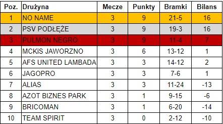 W pierwszym meczu PSV Podłęże pewnie wygrywa z zespołem Alias, Jędrzej Krawczyk strzela w tym meczu cztery bramki i umocnił się na prowadzeniu w klasyfikacji króla strzelców ligi. W drugim meczu podział punktów i dzięki temu pierwsze punkty w tym sezonie zdobywają zawodnicy Azot i Bricomana. W trzecim meczu pewne i wysokie zwycięstwo Jago nad Lambadą, kolejny mecz również zwycięstwo faworyta - Pulmon pokonuje Team Spirit. Ostatni mecz zapowiadał się jako hit kolejki, grały dwie niepokonane drużyny MCKiS i No Name, lepiej mecz rozpoczynają "Bezimienni" i do przerwy prowadzą 2:0, w drugiej połowie MCKiS próbował wyjść wyżej do przeciwnika, taka gra odpowiadała No Name, który szybkimi kontratakami punktował MCKiS, ostatecznie skończyło się wysokim zwycięstwem ekipy "Koniora" i utrzymaniem prowadzenia w ligowej tabeli.