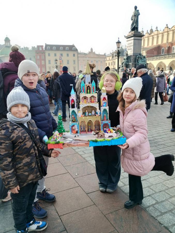 Stworzona przez dzieci szopka ma przedstawiać krakowski rynek, na którym toczy się codzienne życie. Na makiecie można dostrzec kwiaciarki, sprzedawcę obwarzanków, a nawet dorożkę, w której siedzą twórcy pracy. Dzieci w swojej pracy chciały również przedstawić podziemie rynku.