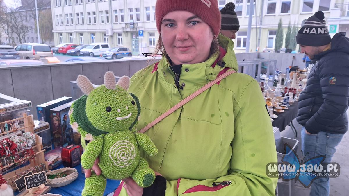 Pani Paulina przygotowała własnoręcznie piękne choinki i torebki na butelki. Jej mama wydziergała zielonego smoka. Pani Paulina nie ma wprawdzie pojęcia, co to za smok i co mamę zainspirowało, bo jak uzasadniła na smokach się nie znają, co oczywiście nie przeszkadza w tym, że smok wyszedł „pierwsza klasa”.