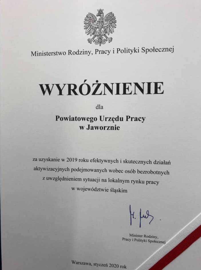 Jaworznicki urząd pracy został nagrodzony za skuteczne i efektywne działania aktywizacyjne podejmowane wobec osób bezrobotnych w 2019 roku.