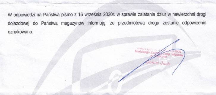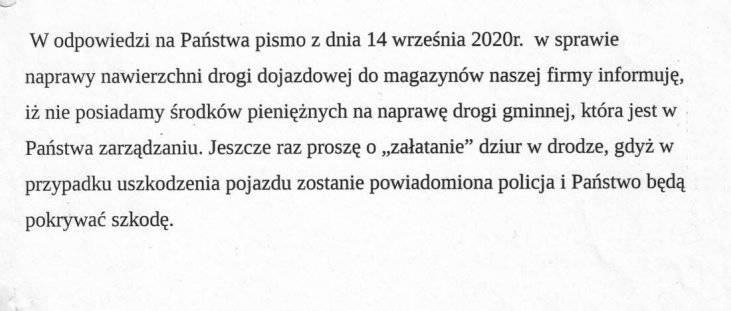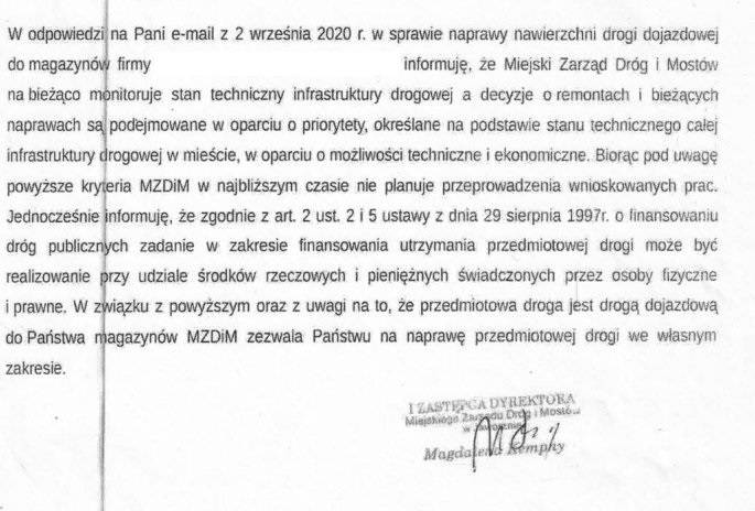 W odpowiedzi na pierwsze pismo do MZDiM odpowiedź była taka, że MZDiM nie planuje przeprowadzenia remontu. Natomiast poinformował, że przedsiębiorca otrzymał zezwolenie na naprawę drogi we własnym zakresie. Za własne pieniądze.
