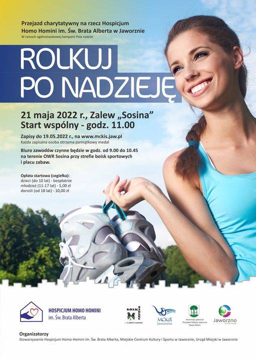 To już 7 edycja akcji charytatywnej "Rolkuj Po Nadzieję", którą wspólnie z MCKiS Jaworzno Hospicjum Homo Homini im. Św. Brata Alberta organizuje dla miłośników rolek i relaksu na świeżym powietrzu w malowniczej scenerii, bowiem po 2 letniej, spowodowanej pandemią przerwie, ponownie akcja wraca na OWR Sosina. Akcja nie ma charakteru typowej rywalizacji sportowej, jest rekreacyjnym “rolkowaniem” dla naszego Hospicjum Homo Homini im. Św. Brata Alberta w Jaworznie.