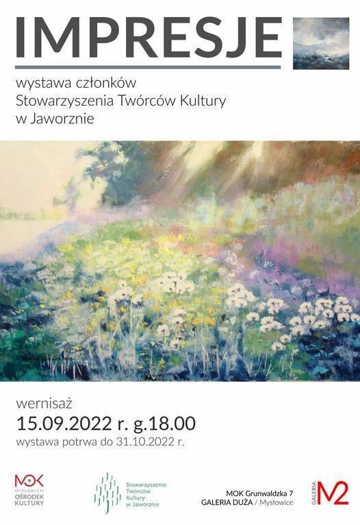 Stowarzyszenie Twórców Kultury Jaworzno zaprasza na coroczną wystawę zbiorową. Tym razem artyści goszczą w Mysłowickim Ośrodku Kultury w Galerii Dużej. Uroczyste otwarcie wystawy i spotkanie z Twórcami zaplanowane jest 15 września na godz. 18,