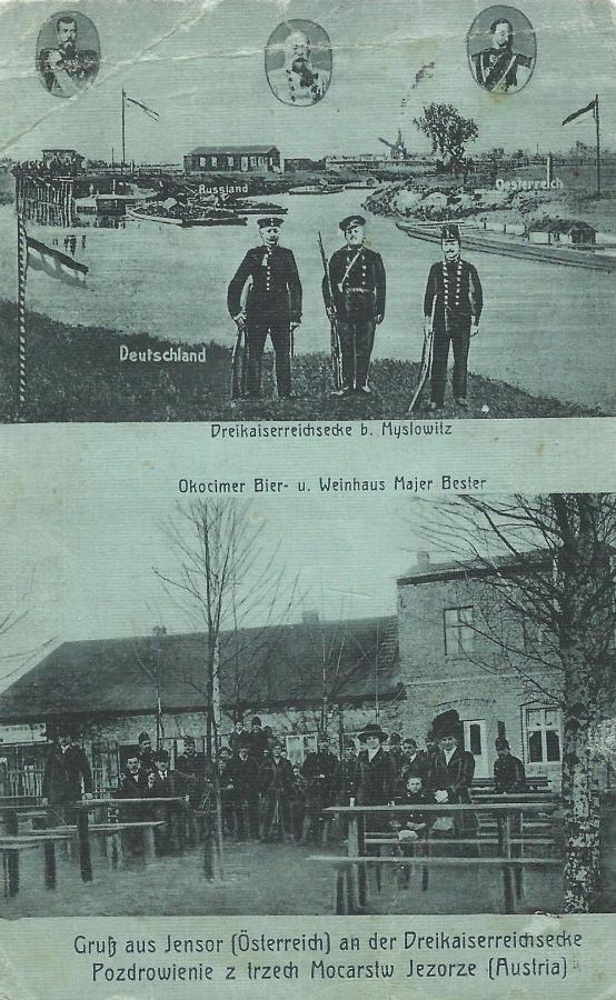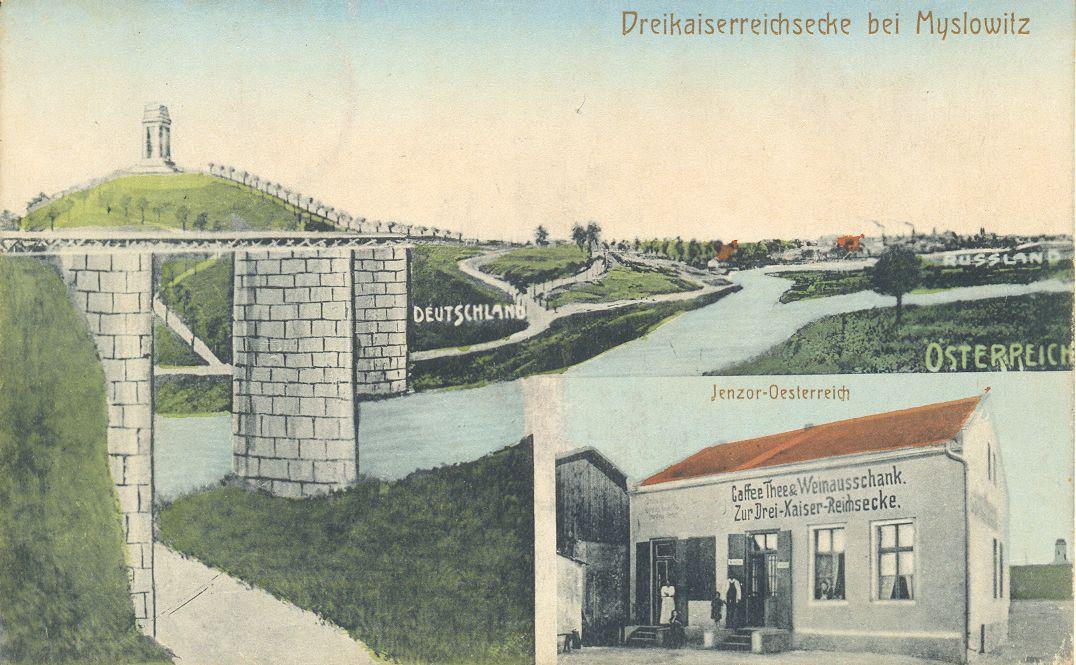 Z kronikarskiego obowiązku przypominamy, że Kąt Trzech Cesarstw (Drei-Kaiser-Reichs-Ecke) powstał w 1871 r. Wtedy to król Prus, Wilhelm I Hohenzollern został cesarzem. Wcześniej cesarstwami była już Austria (Jaworzno) i Rosja (Sosnowiec). Trójkąt to w zasadzie styk granic tychże cesarstw w miejscu ujścia Białej Przemszy do Czarnej. Miejsce to urosło do jednej z największych atrakcji turystycznych na pograniczu Małopolski i Śląska. Do ,,Trójkąta” przyjeżdżały ok. 1900 r. tłumy turystów. To przełożyło się na budowę infrastruktury gastronomicznej.