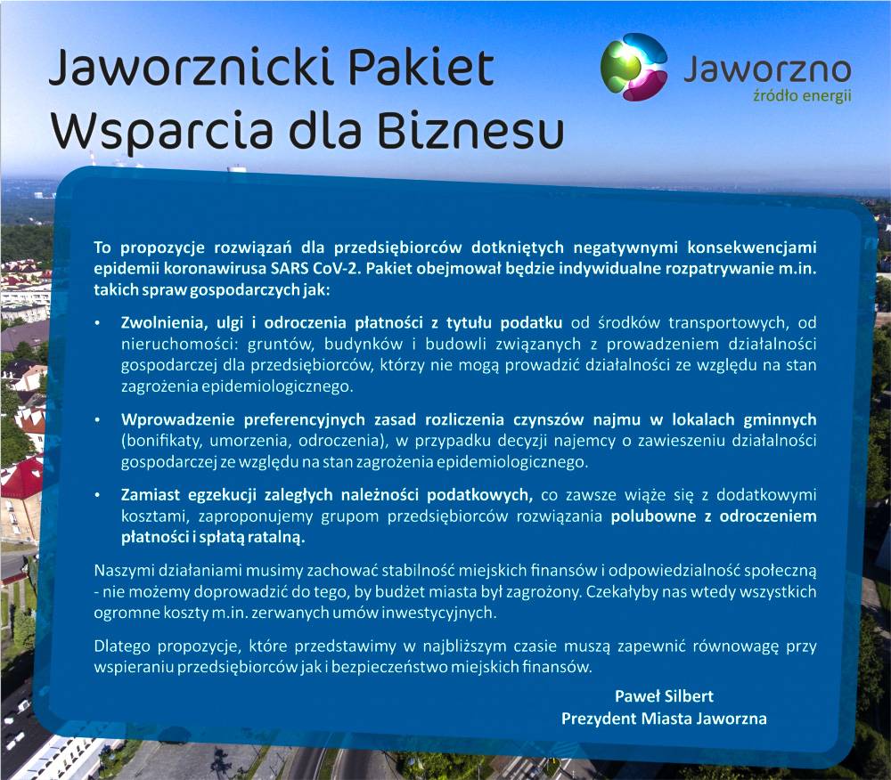 Samorząd zapowiedział Pakiet Wsparcia dla Biznesu w Jaworznie. Zaproponowano kilka możliwych rozwiązań w kategorii zwolnień od podatków lokalnych, ulg w czynszach najmu lokali gminnych oraz odroczenie spłat zaległości podatkowych lub ich rozłożenie na raty. Komunikat jest również odpowiedzią na list Jaworznickiej izby Gospodarczej do prezydenta miasta. Urząd zapowiada, że te wnioski będą rozpatrywane indywidualnie. Jeszcze nie ma wzorów winsoków ani procedur mówiących o wymaganiach i warunkach. Założenia "Jaworznickiego Pakietu Wsparcia dla Biznesu"