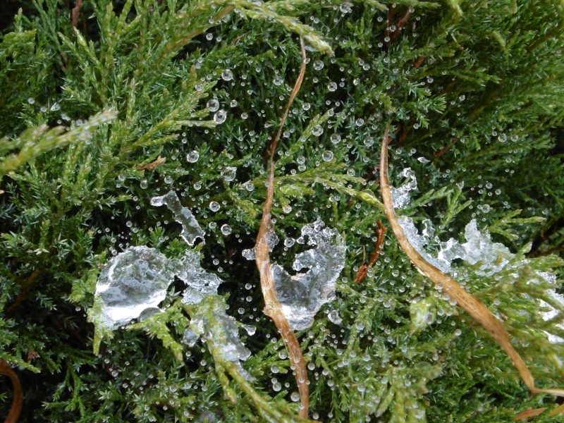 Idę dalej wzdłuż ulicy Pocztowa. Oto topniejący śnieg w krzewie jałowca wirginijskiego - Juniperus Wirginiana.