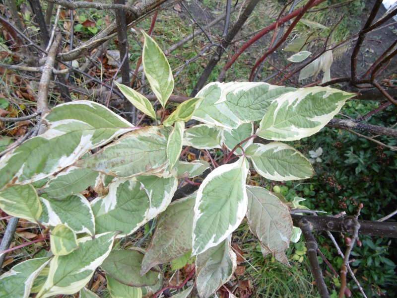 Przy drodze znajduje się urządzony kawałek zieleni. Ozdabia go między innymi dereń biały - Cornus alba "Elegantissima".