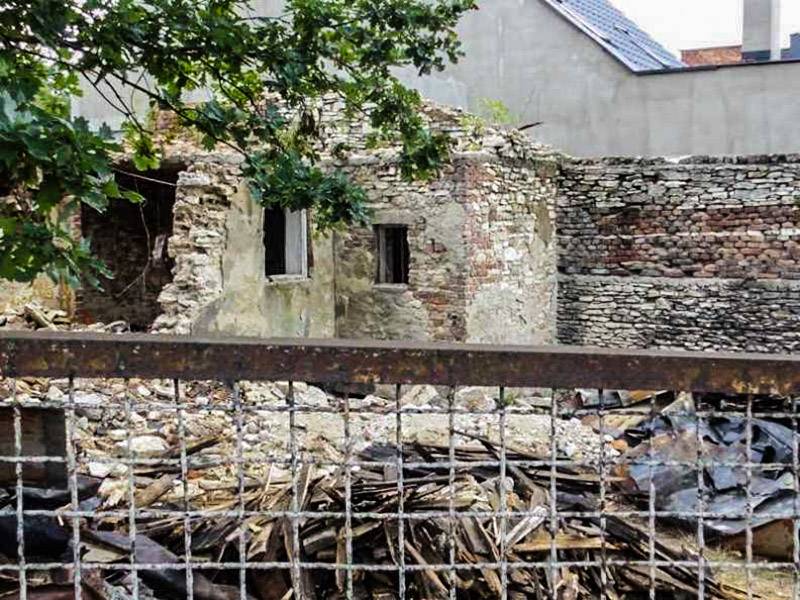 Za dębem znajduje się kolejna część zabudowań w stanie zejściowym.