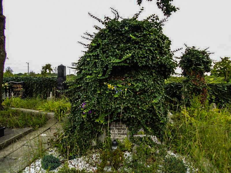 Inny nagrobek skrywa się pod bluszczem pospolitym - Hedera helix.