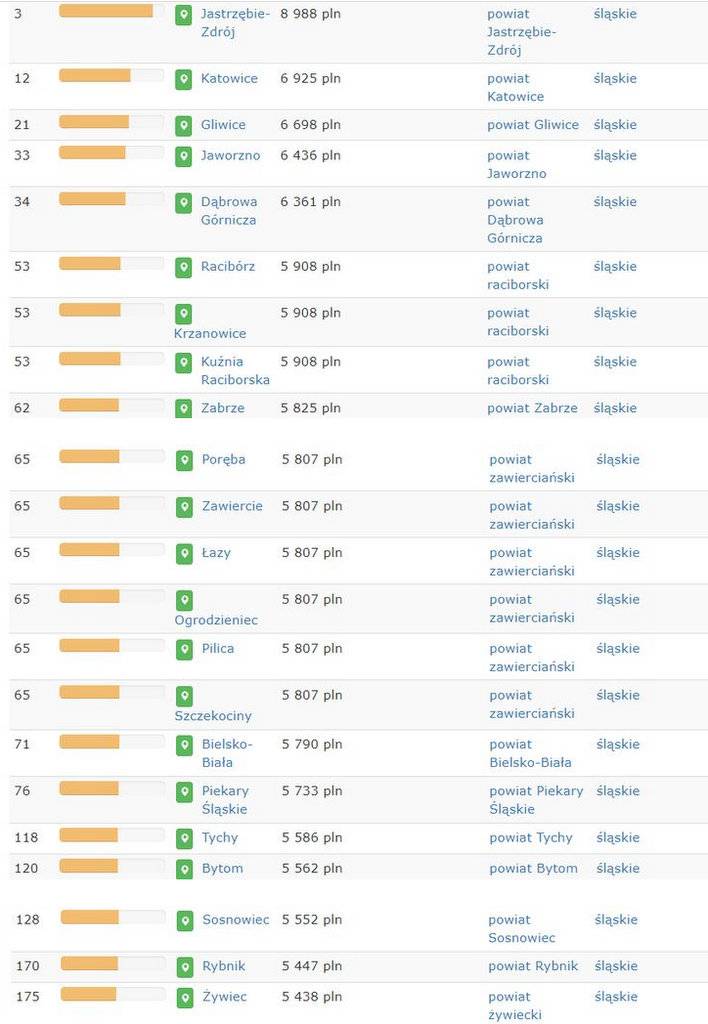 Jaworzno w rankingu zajęło 4. miejsce w województwie śląskim z wynagrodzeniem wynoszącym 6436 złotych brutto. W skali kraju jest to 33. miejsce. Miastem z najlepszą pozycją w naszym województwie jest Jastrzębie-Zdrój, ze średnim miesięcznym wynagrodzeniem brutto w wysokości 8988 złotych.