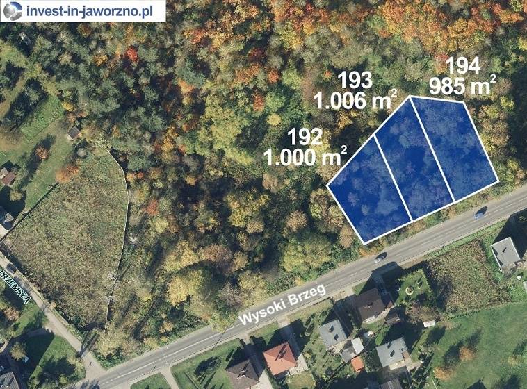 Oferta dotyczy działek o powierzchni 1000m² (nr 192), 1006 m2 (nr 193) i 985 m2 (nr 194) położonych przy ul. Wysoki Brzeg w Jaworznie.