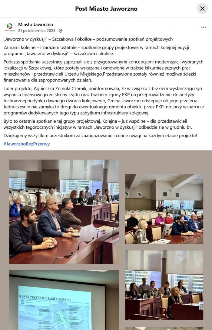 Kilka dni później, 21 października, jaworznicki urząd miejski w mediach społecznościowych zamieścił informację o podsumowaniu spotkań projektowych w ramach programu "Jaworzno w dyskusji" - Szczakowa i okolice. Wówczas dowiedzieliśmy się, że miasto nie przejmie dworca PKP, co tłumaczono "brakiem wystarczającego wsparcia finansowego ze strony rządu oraz brakiem zgody PKP na przeprowadzenie ekspertyzy technicznej budynku".