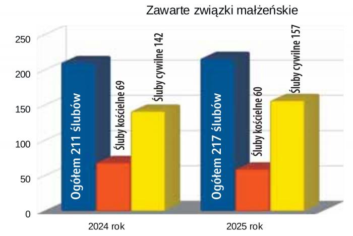 W 2025 roku zawarto 217 małżeństw, w tym 60 ślubów kościelnych, 157 ślubów cywilnych. Poza tym 33 pary wzięły ślub poza granicami kraju. W modę wchodzi też zawieranie małżeństw cywilnych poza urzędem stanu cywilnego, takich ceremonii ślubnych poza USC było 12.
