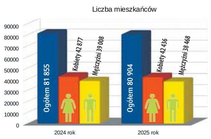 W 2024 roku miasto liczyło 81 855 osób, w tym 42 877 kobiet i 39 008 mężczyzn. Porównując liczbę mieszkańców w 2025 r. z rokiem 2024 należny stwierdzić, że nas ubyło o 951 osób.