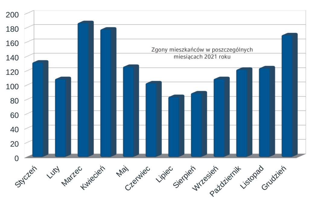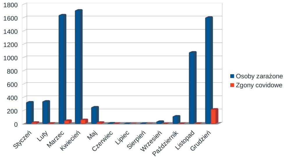 Miesiące wiosenne marzec (1641 zakażeń i 51 zgonów) i kwiecień (713 zakażeń oraz 63 zgony) oraz grudzień (1605 zakażeń i 40 zgonów) to miesiące o dużej ilości zakażeń oraz ilości zmarłych osób na covid.