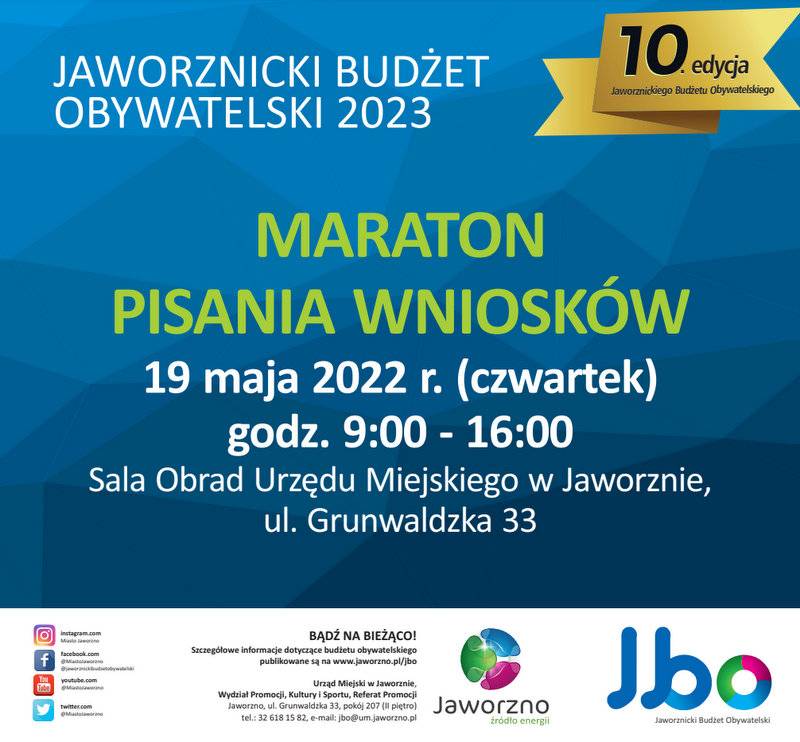 Przypominamy, że od 9 maja br. jaworznianie mogą składać swoje wnioski z pomysłami. Formularze wniosków można pobrać ze strony internetowej www.jaworzno.pl/jbo/. Nabór wniosków potrwa do 31 maja!