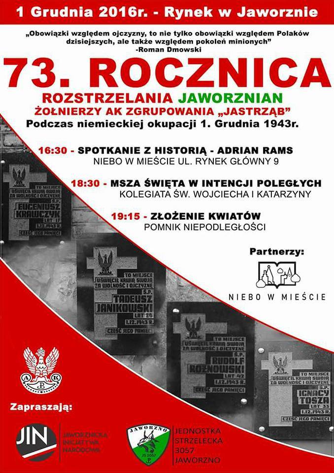 W nocy z 30 listopada na 1 grudnia 1943 roku, Niemcy dokonali rozstrzelania 10 mieszkańców Jaworzna. Bojowników Armii Krajowej, Zgrupowania ,,Jastrząb". Jaworznicka Inicjatywa Narodowa wraz z Jednostką Strzelecką 3057, postanowiła upamiętnić to wydarzenie uroczystościami, które odbędą się w najbliższy czwartek, czyli właśnie 1 grudnia, w 73 rocznicę mordu.