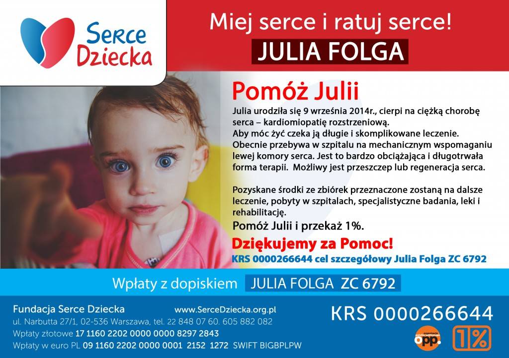 Julia Folga urodziła się 9 września 2014r., 3 miesiące później wykryto u niej bardzo ciężką chorobę serca – kardiomiopatię rozstrzeniową. Julia trafiła do Górnośląskiego Centrum Zdrowia Dziecka w Katowicach na oddział kardiologii z nagłym przerostem lewej komory do rozmiarów komory 7 letniego dziecka.