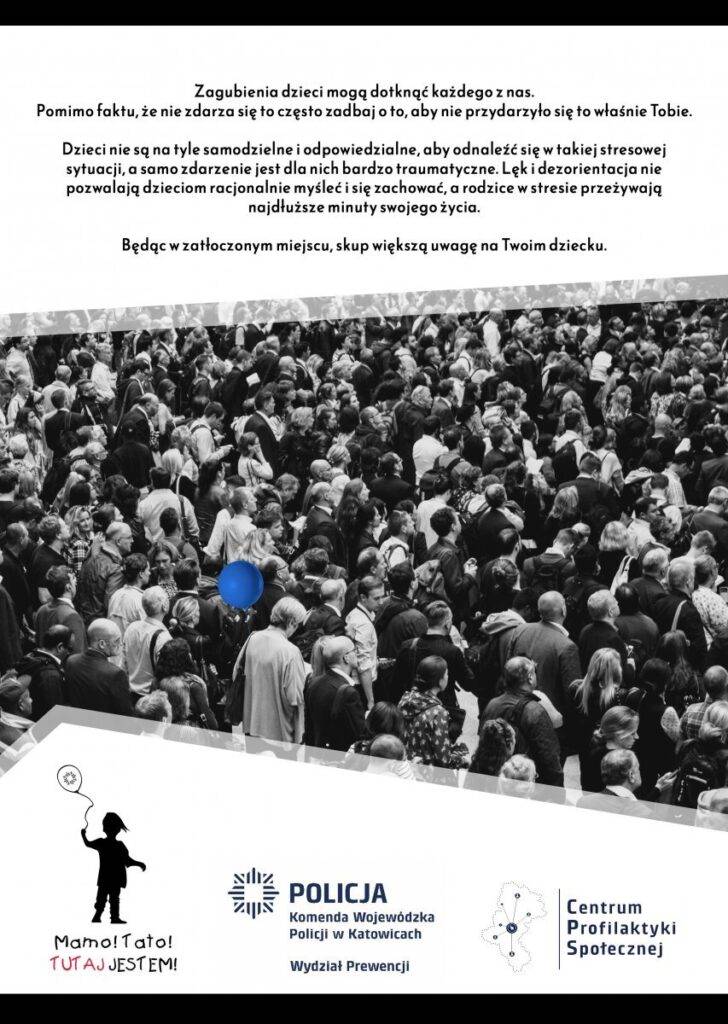 Śląska Policja rozpoczyna nową kampanię społeczną pn. „Mamo! Tato! Tutaj jestem”. Na działania złożą się bezpośrednie rozmowy z mieszkańcami miast, edukacja najmłodszych i rodziców, a także kampania informacyjna w mediach. Ma to za zadanie przestrzegać i chronić najmłodszych obywateli naszego społeczeństwa przed zaginięciami