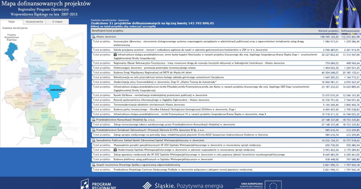 Po prostu dajesz się manipulować Matysikowi, zamiast samemu sprawdzić u źródła :-) Jako przykład typowej inwestycji dofinansowanej przez Urząd Marszałkowski podałem taki najbliżej Jaworzna. W najbliższej okolicy masz takich przykładów więcej: Kryta pływalnia przy Szkole Podstawowej w Strzemieszycach, Wartość: 7 937 000,00 zł Hala zapaśnicza przy KS "Siła" Mysłowice, Wartość: 1 459 000,00 zł Hala sportowa przy Gimnazjum w Imielinie, Wartość: 11 951 000,00 zł W dalsze rejony województwa nawet nie warto się zapuszczać, bo można się załamać, ile kasy idzie z budżetu Urzędu Marszałkowskiego i NA CO!!!. A przez 16 lat ani złotówka nie trafiła do Jaworzna!!!
