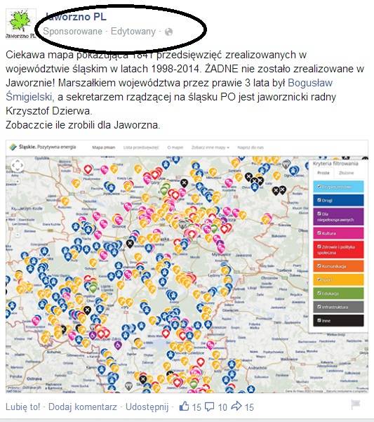 To jest przykład kolejnego braku wiedzy na temat na który się piszę. Po pierwsze mapa przygotowana przez Urząd Marszałkowski prezentuje inwestycje realizowane tylko z pieniędzy Urzędu Marszałkowskiego, a Franek mówi i pyta o inwestycje, które miasto zrealizowało z RPO, czyli kasy unijnej. A o te pieniądze mogą starać się i zabiegać władze miasta. Tak więc materiał pokazuje ile Silbert i jego ekipa powzięła starań aby ściągnąć pieniądze unijne do Jaworzna. A i niezła reklama dla profilu jaworzno.pl :) Artykuł wyskakuje jako sponsorowany bo to sugeruje, że ktoś z naszych znajomych to polubił. Jeśli jaw.pl byłoby w znajomych użytkownika jaworzno.pl na FB nic takiego by się nie wyświetlało. Ale to każdy wie, kto choć trochę korzysta z facebooka w formie podstawowej :)