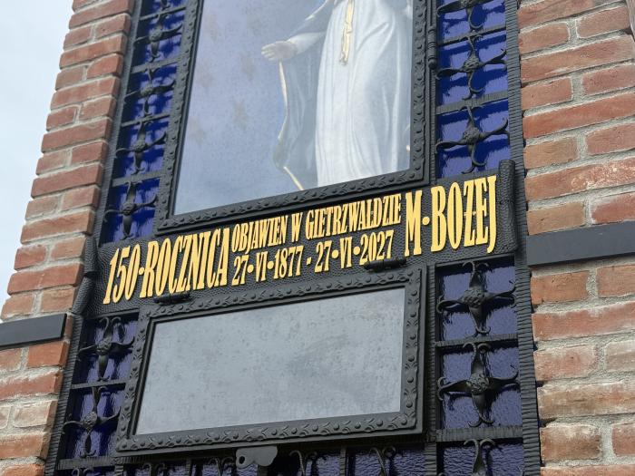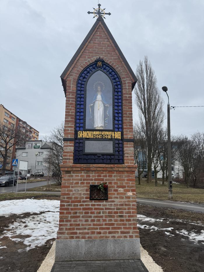 Kapliczka gietrzwałdzka w centrum Jaworzna jest już gotowa oraz odsłonięta. Z terenu zniknęło ogrodzenie, które ją zasłaniało, a obiekt został udekorowany pierwszymi kwiatami.