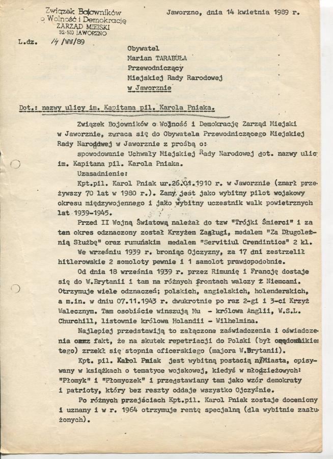 W kwietniu roku 1989 związek Bojowników o Wolność i Demokracje zwrócił się do przewodniczącego Miejskiej Rady Narodowej, Mariana Tarabuły o podjęcie uchwały dotyczącej nadania ulicy jego imienia.
