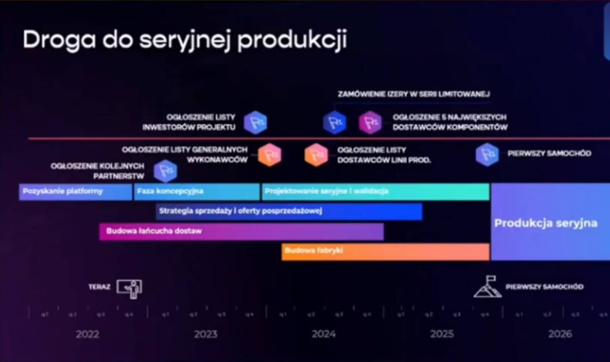 W trakcie konferencji przedstawiono również harmonogram prac związanych z Izerą. Budowa fabryki się rozpocząć na początku 2024 roku, a zakończyć w 2025. Pod koniec 2025 ma wystartować produkcja samochodów.