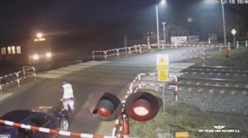 Widząc zmagania rozgrywające się po drugiej stronie przejazdu, z pomocą kierowcy spieszy funkcjonariusz Straży Ochrony Kolei, dla pewności uniemożliwiając kierującemu dalsze manewry aż do czasu przejechania pociągu.