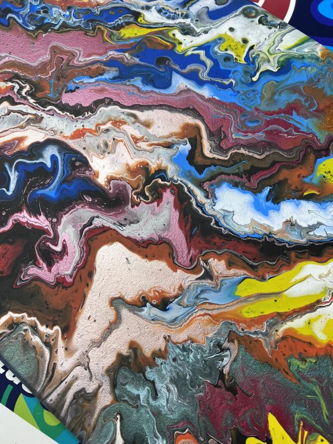 Dwa złożone na aukcję obrazy wykonano farbami akrylowymi metodą pouringu. Obrazy mają wymiary 52x60 cm i 50x70 cm. Te obrazy to praca zbiorowa klubowiczów. Powstały pod okiem pani Teresy Szafrugi. "Obrazy w kolorach żywych. Doskonale będą pasować do urządzenia i wystroju wnętrz nowoczesnych. Jeden w dominacji złotej, a drugi różnokolorowy" - tak klubowicze przekonująco opisują te oryginalne obrazy.