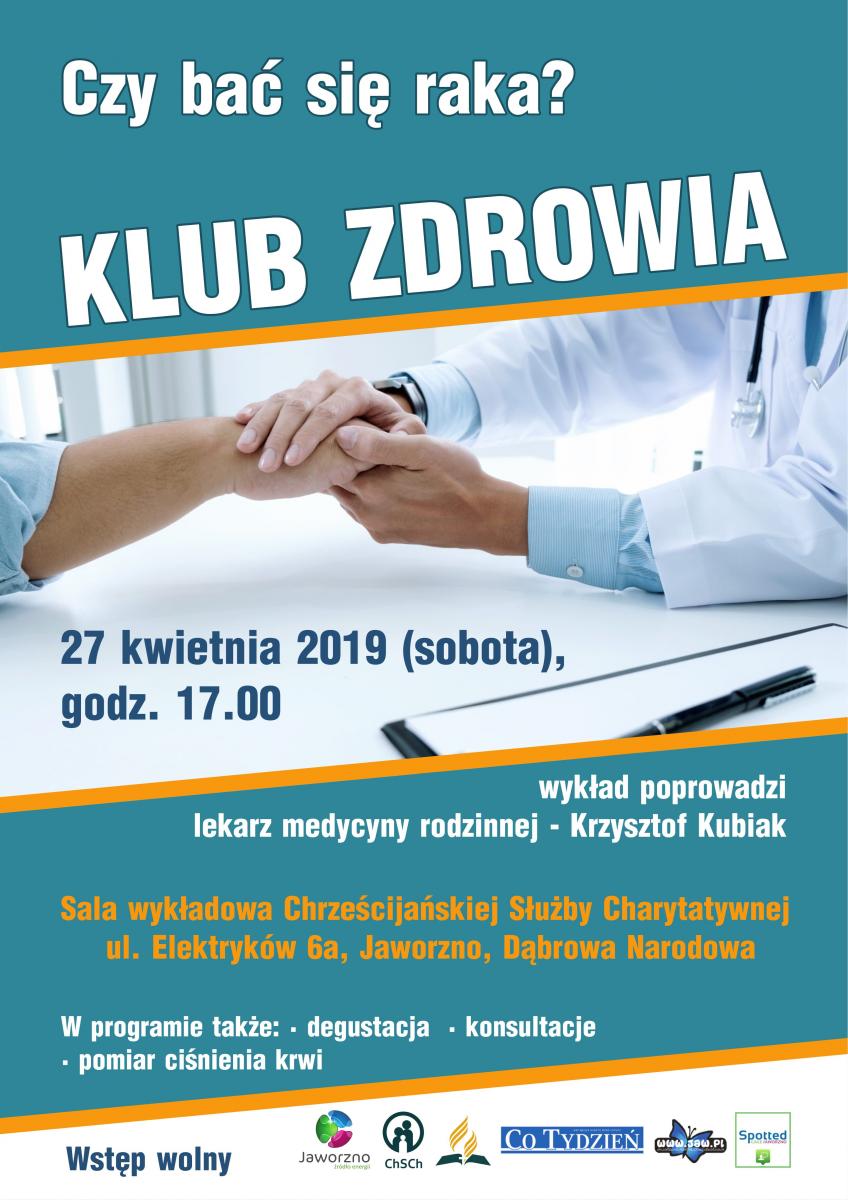 Jaworznicki Klub Zdrowia prowadzony przez Chrześcijańską Służbę Charytatywną zaprasza na kolejny bardzo ważny wykład. Tym razem prelekcja poświęcona będzie chorobom nowotworowym. Wykład zatytułowano:  "Czy bać się raka?"