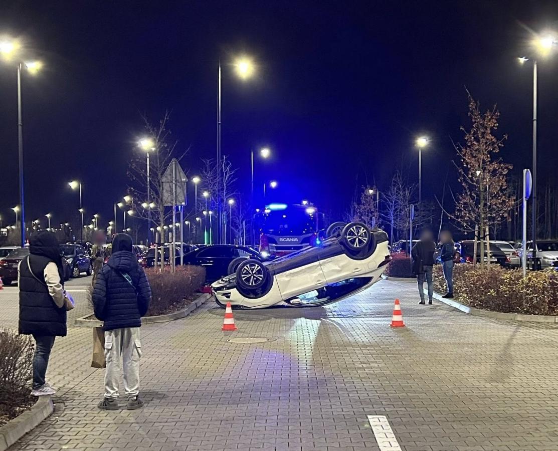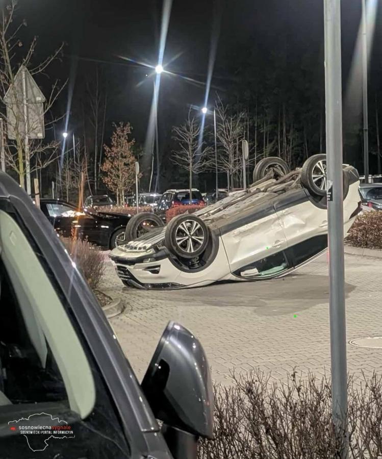 Siła uderzenia była tak duża, że auto kobiety obróciło się i wylądowało na dachu pośrodku parkingu. Na miejsce wezwano służby ratunkowe, m.in. policje oraz straż pożarną. Na szczęście nikomu nic poważnego się nie stało.