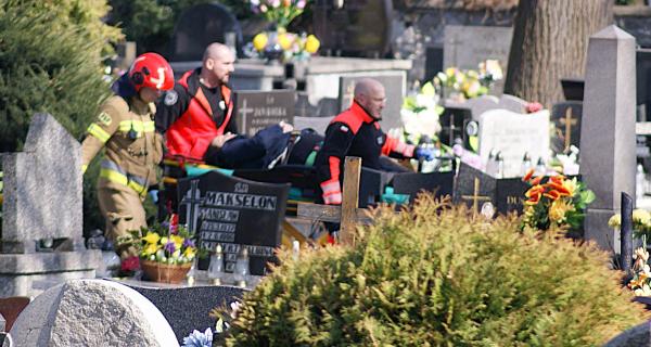 Kobieta wpadła do grobu na cmentarzu ciężkowickim w Jaworznie. Przedświąteczna wizyta zakończyła się nietypowym i groźnym wypadkiem. Na ratunek ruszyli strażacy z Jaworzna.